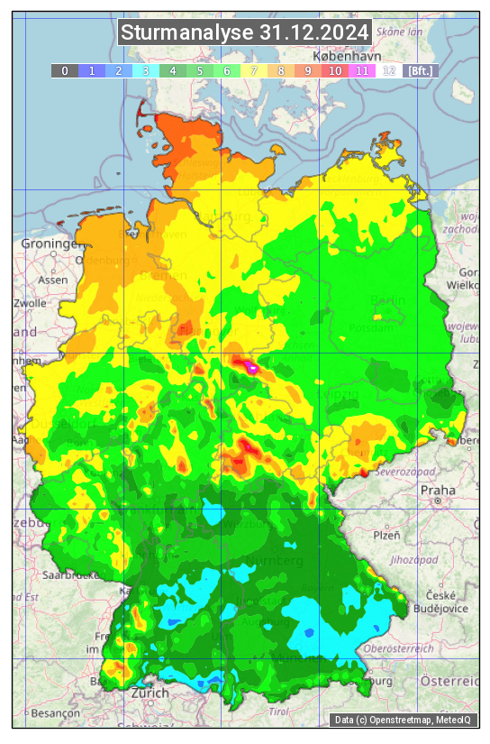 Die Sturmanalyse vom 31.12.2024 zeigt die maximalen Windböen des Tages. Die Angabe erfolgt als Windstärke in Beaufort.