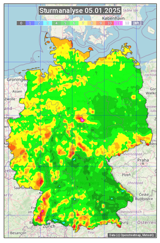 Die Sturmanalyse vom 05.01.2025 zeigt die maximalen Windböen des Tages. Die Angabe erfolgt als Windstärke in Beaufort.