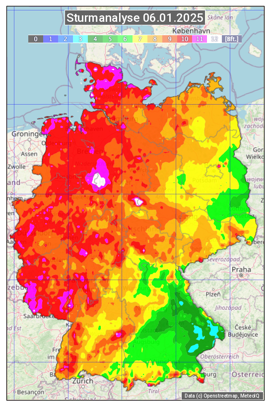 Die Sturmanalyse vom 06.01.2025 zeigt die maximalen Windböen des Tages. Die Angabe erfolgt als Windstärke in Beaufort.