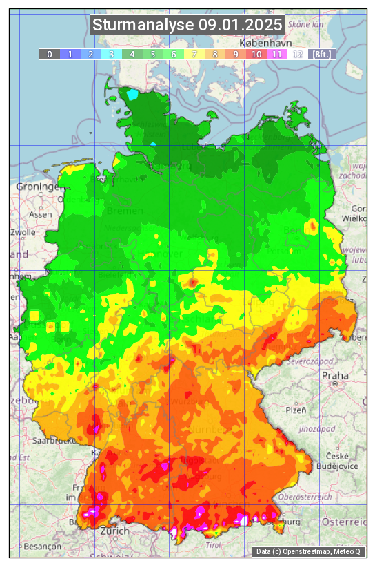 Die Sturmanalyse vom 09.01.2025 zeigt die maximalen Windböen des Tages. Die Angabe erfolgt als Windstärke in Beaufort.