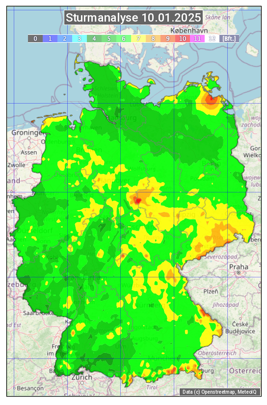 Die Sturmanalyse vom 10.01.2025 zeigt die maximalen Windböen des Tages. Die Angabe erfolgt als Windstärke in Beaufort.