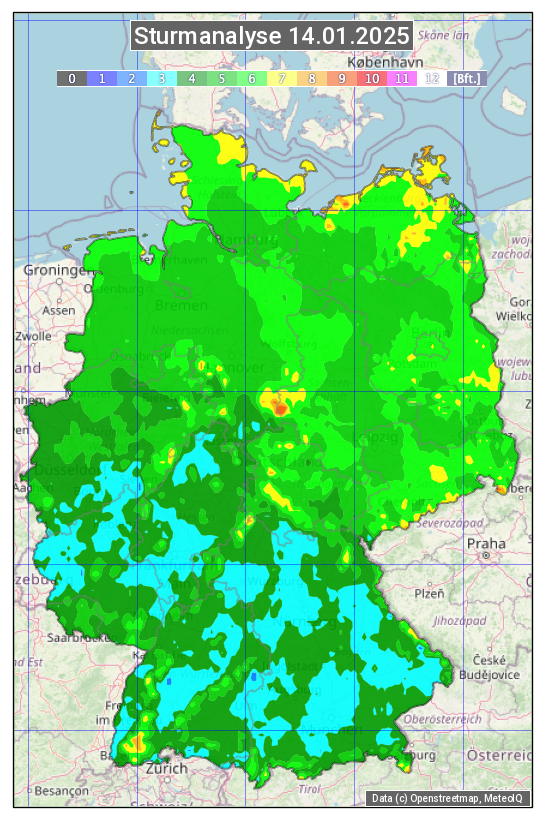 Die Sturmanalyse vom 14.01.2025 zeigt die maximalen Windböen des Tages. Die Angabe erfolgt als Windstärke in Beaufort.