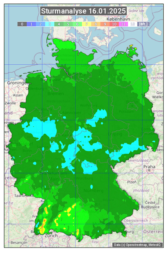 Die Sturmanalyse vom 16.01.2025 zeigt die maximalen Windböen des Tages. Die Angabe erfolgt als Windstärke in Beaufort.