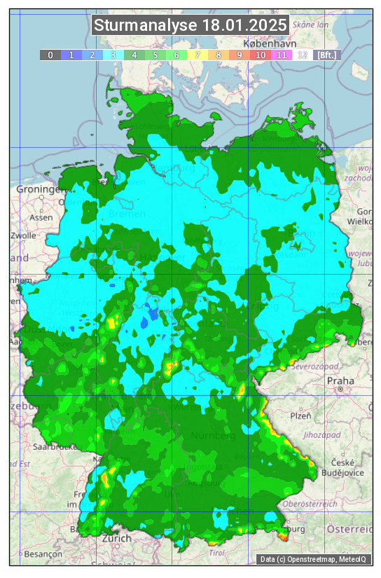 Die Sturmanalyse vom 18.01.2025 zeigt die maximalen Windböen des Tages. Die Angabe erfolgt als Windstärke in Beaufort.