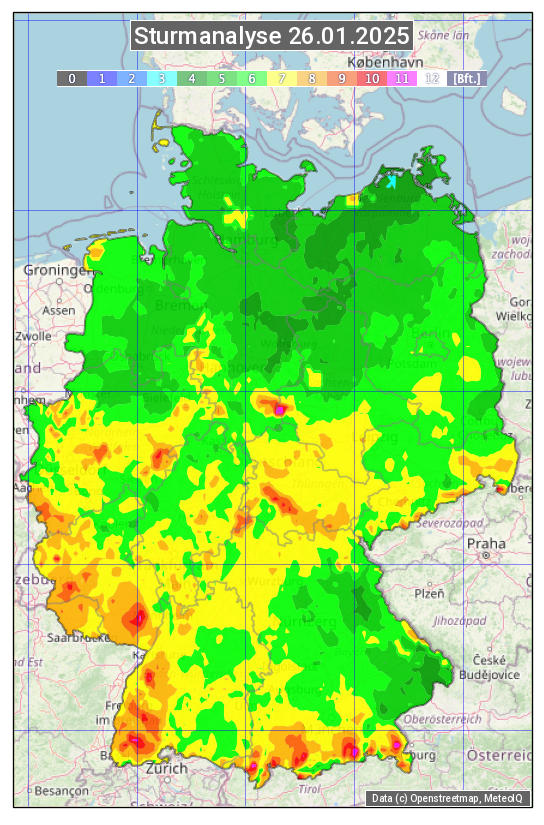 Die Sturmanalyse vom 26.01.2025 zeigt die maximalen Windböen des Tages. Die Angabe erfolgt als Windstärke in Beaufort.