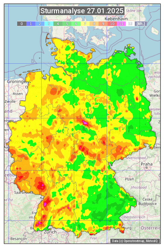 Die Sturmanalyse vom 27.01.2025 zeigt die maximalen Windböen des Tages. Die Angabe erfolgt als Windstärke in Beaufort.
