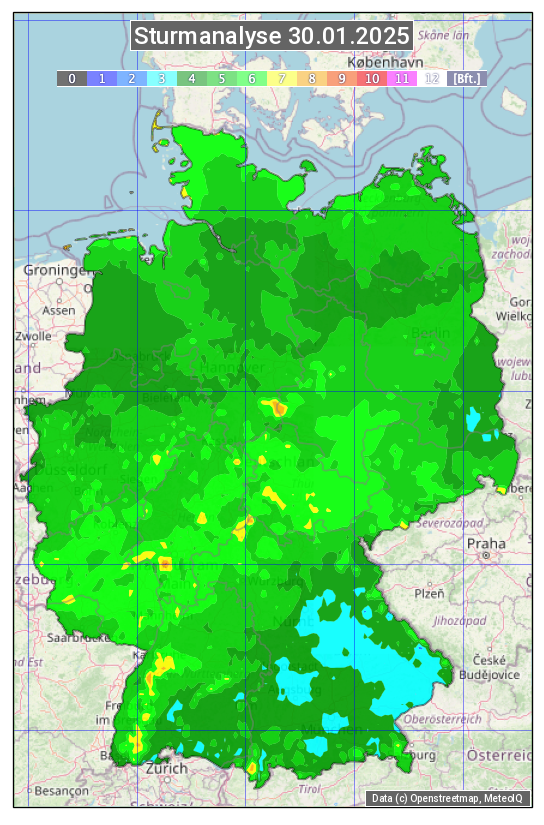 Die Sturmanalyse vom 30.01.2025 zeigt die maximalen Windböen des Tages. Die Angabe erfolgt als Windstärke in Beaufort.