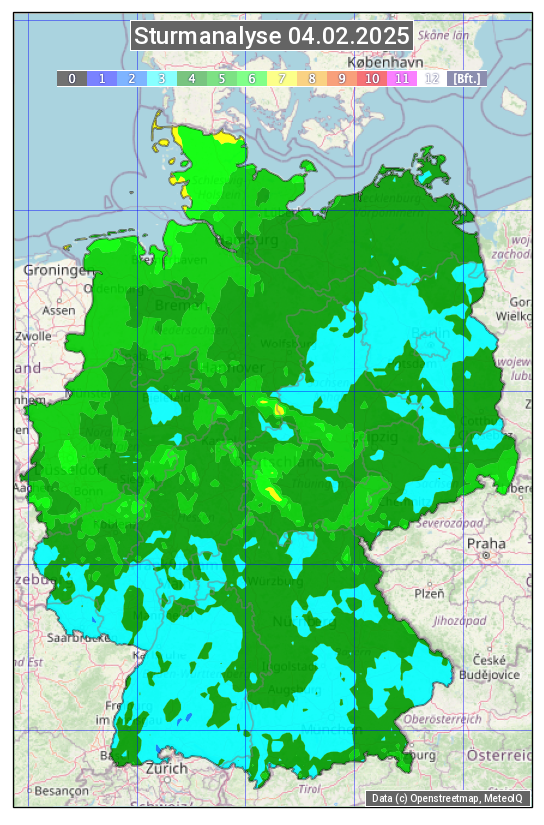Die Sturmanalyse vom 04.02.2025 zeigt die maximalen Windböen des Tages. Die Angabe erfolgt als Windstärke in Beaufort.