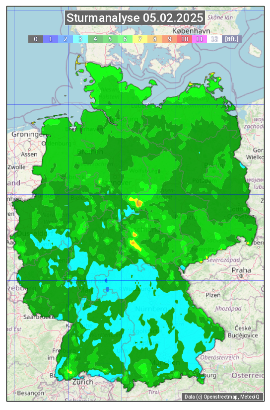 Die Sturmanalyse vom 05.02.2025 zeigt die maximalen Windböen des Tages. Die Angabe erfolgt als Windstärke in Beaufort.