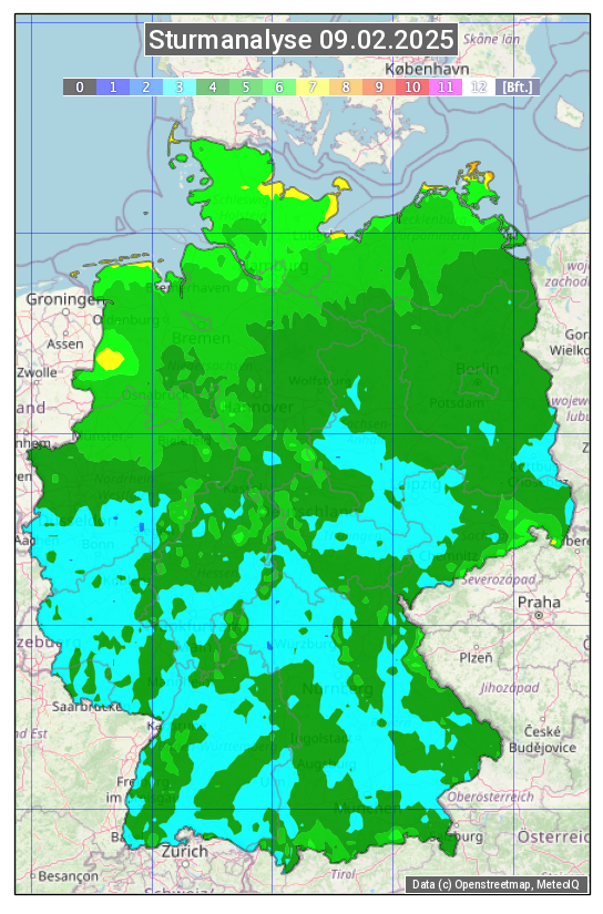 Die Sturmanalyse vom 09.02.2025 zeigt die maximalen Windböen des Tages. Die Angabe erfolgt als Windstärke in Beaufort.