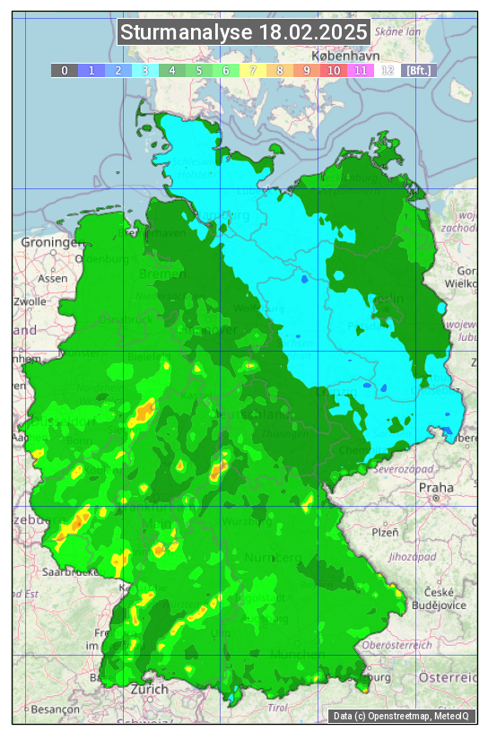 Die Sturmanalyse vom 18.02.2025 zeigt die maximalen Windböen des Tages. Die Angabe erfolgt als Windstärke in Beaufort.