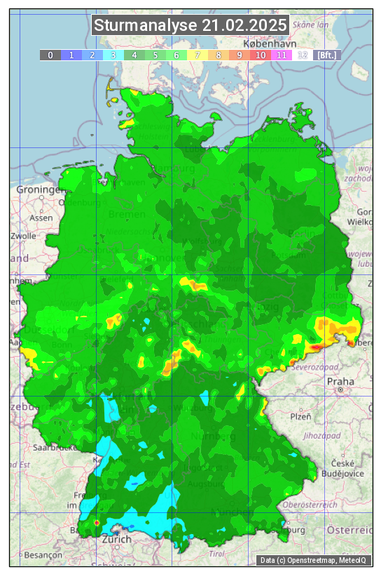 Die Sturmanalyse vom 21.02.2025 zeigt die maximalen Windböen des Tages. Die Angabe erfolgt als Windstärke in Beaufort.