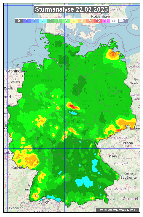 Die Sturmanalyse vom 22.02.2025 zeigt die maximalen Windböen des Tages. Die Angabe erfolgt als Windstärke in Beaufort.
