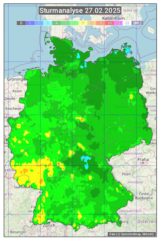 Die Sturmanalyse vom 27.02.2025 zeigt die maximalen Windböen des Tages. Die Angabe erfolgt als Windstärke in Beaufort.