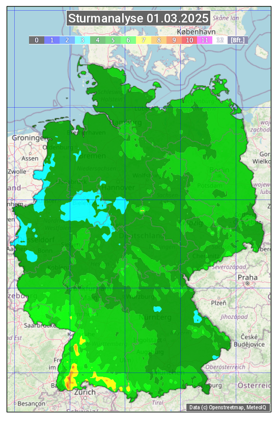 Die Sturmanalyse vom 01.03.2025 zeigt die maximalen Windböen des Tages. Die Angabe erfolgt als Windstärke in Beaufort.