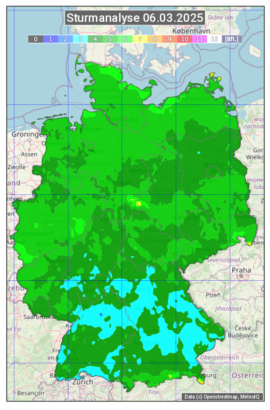 Die Sturmanalyse vom 06.03.2025 zeigt die maximalen Windböen des Tages. Die Angabe erfolgt als Windstärke in Beaufort.