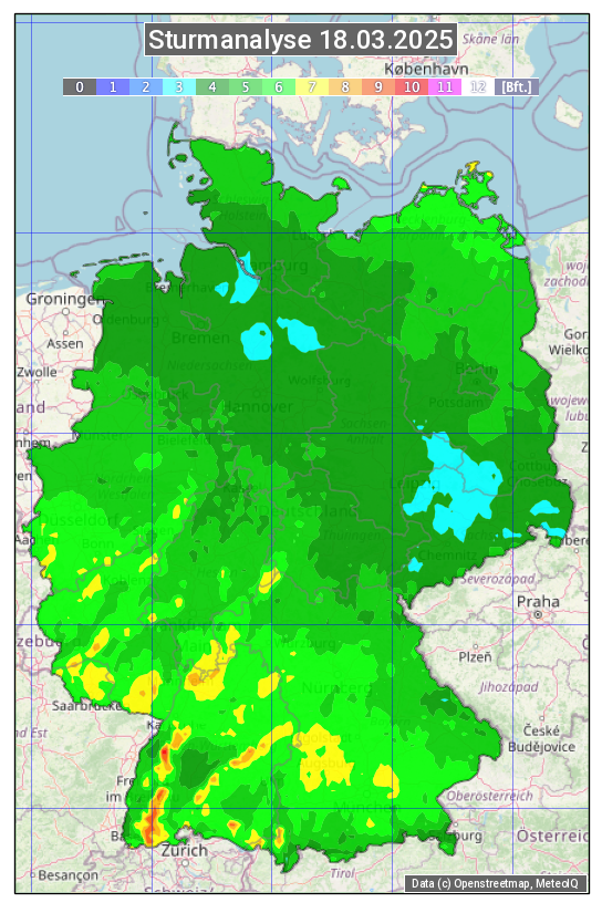 Die Sturmanalyse vom 18.03.2025 zeigt die maximalen Windböen des Tages. Die Angabe erfolgt als Windstärke in Beaufort.