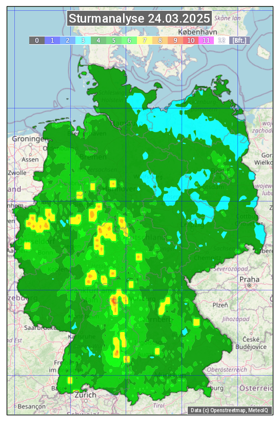 Die Sturmanalyse vom 24.03.2025 zeigt die maximalen Windböen des Tages. Die Angabe erfolgt als Windstärke in Beaufort.