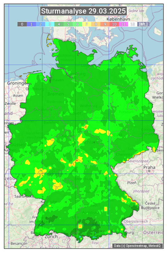 Die Sturmanalyse vom 29.03.2025 zeigt die maximalen Windböen des Tages. Die Angabe erfolgt als Windstärke in Beaufort.