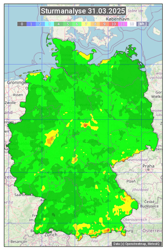 Die Sturmanalyse vom 31.03.2025 zeigt die maximalen Windböen des Tages. Die Angabe erfolgt als Windstärke in Beaufort.