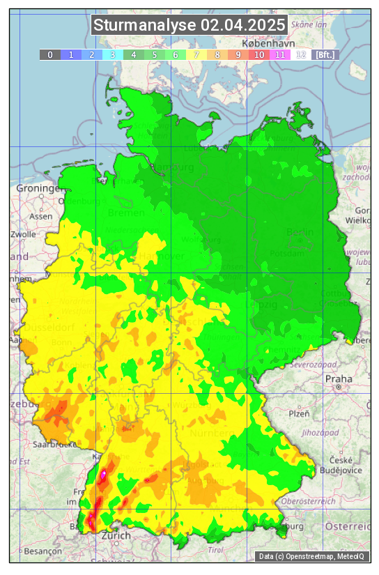 Die Sturmanalyse vom 02.04.2025 zeigt die maximalen Windböen des Tages. Die Angabe erfolgt als Windstärke in Beaufort.