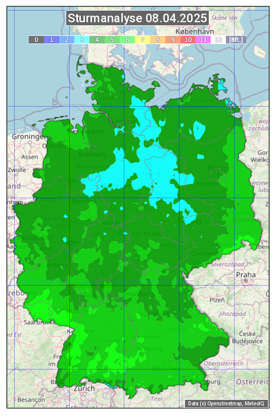 Die Sturmanalyse vom 08.04.2025 zeigt die maximalen Windböen des Tages. Die Angabe erfolgt als Windstärke in Beaufort.