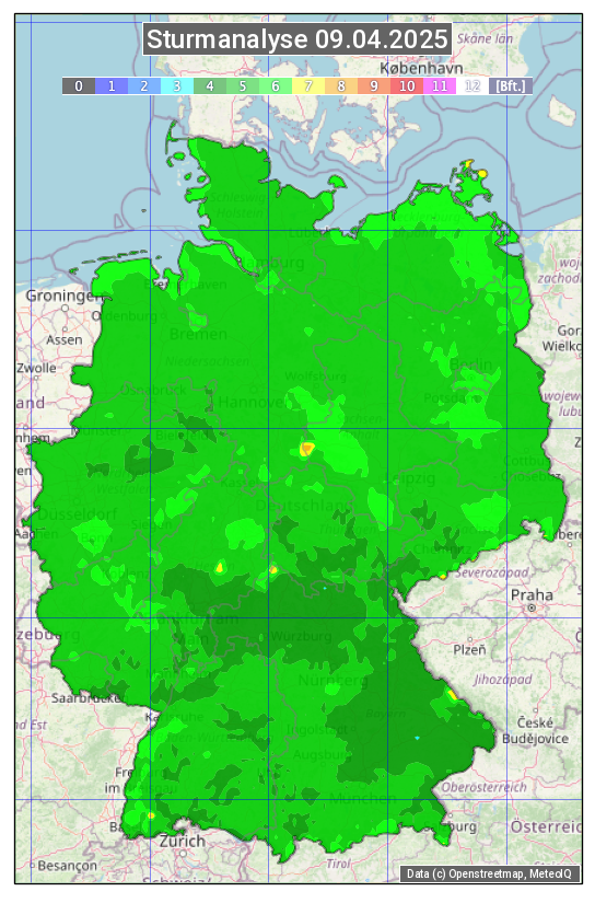 Die Sturmanalyse vom 09.04.2025 zeigt die maximalen Windböen des Tages. Die Angabe erfolgt als Windstärke in Beaufort.