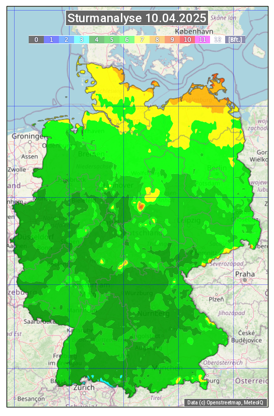 Die Sturmanalyse vom 10.04.2025 zeigt die maximalen Windböen des Tages. Die Angabe erfolgt als Windstärke in Beaufort.