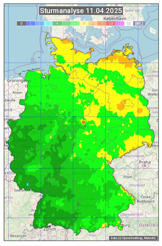 Die Sturmanalyse vom 11.04.2025 zeigt die maximalen Windböen des Tages. Die Angabe erfolgt als Windstärke in Beaufort.