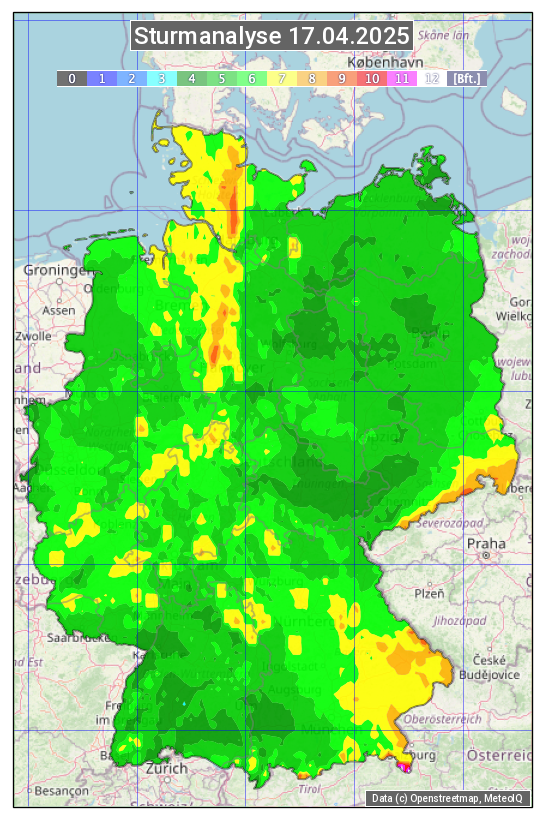 Die Sturmanalyse vom 17.04.2025 zeigt die maximalen Windböen des Tages. Die Angabe erfolgt als Windstärke in Beaufort.