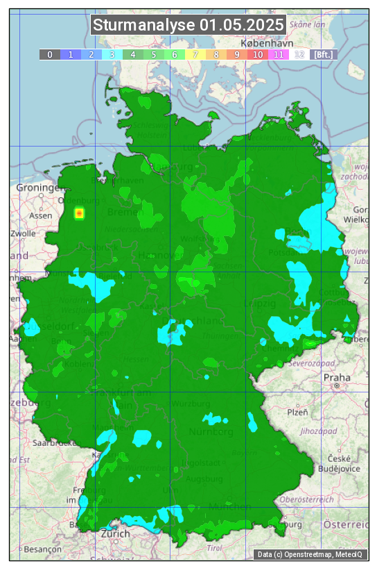 Die Sturmanalyse vom 01.05.2025 zeigt die maximalen Windböen des Tages. Die Angabe erfolgt als Windstärke in Beaufort.
