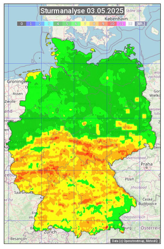 Die Sturmanalyse vom 03.05.2025 zeigt die maximalen Windböen des Tages. Die Angabe erfolgt als Windstärke in Beaufort.