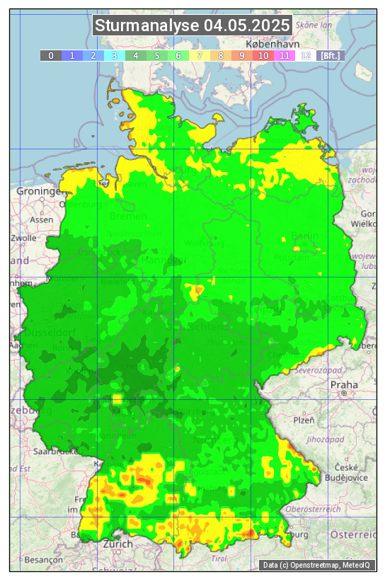 Die Sturmanalyse vom 04.05.2025 zeigt die maximalen Windböen des Tages. Die Angabe erfolgt als Windstärke in Beaufort.