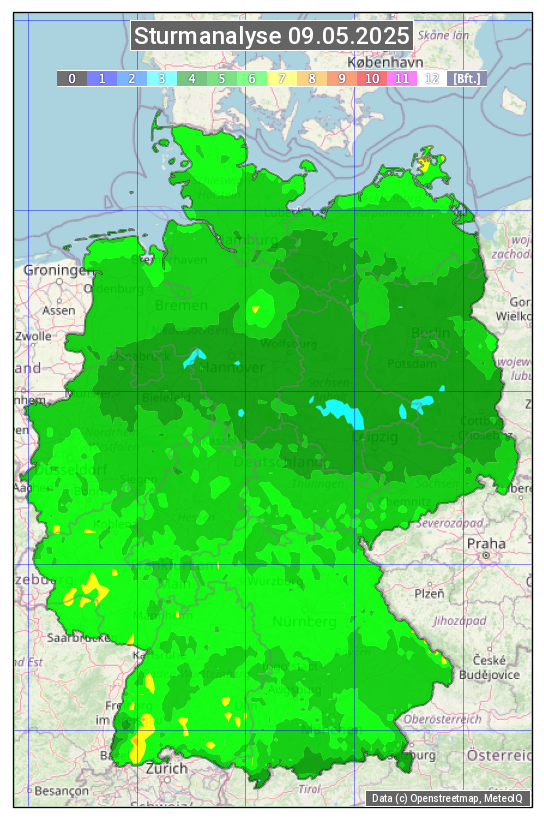 Die Sturmanalyse vom 09.05.2025 zeigt die maximalen Windböen des Tages. Die Angabe erfolgt als Windstärke in Beaufort.