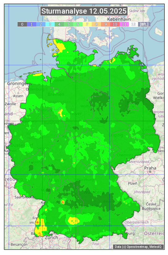 Die Sturmanalyse vom 12.05.2025 zeigt die maximalen Windböen des Tages. Die Angabe erfolgt als Windstärke in Beaufort.