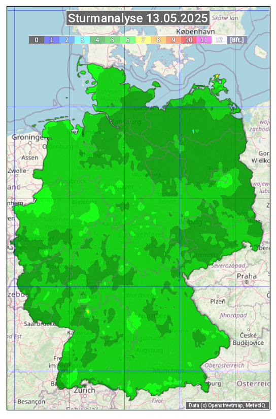 Die Sturmanalyse vom 13.05.2025 zeigt die maximalen Windböen des Tages. Die Angabe erfolgt als Windstärke in Beaufort.