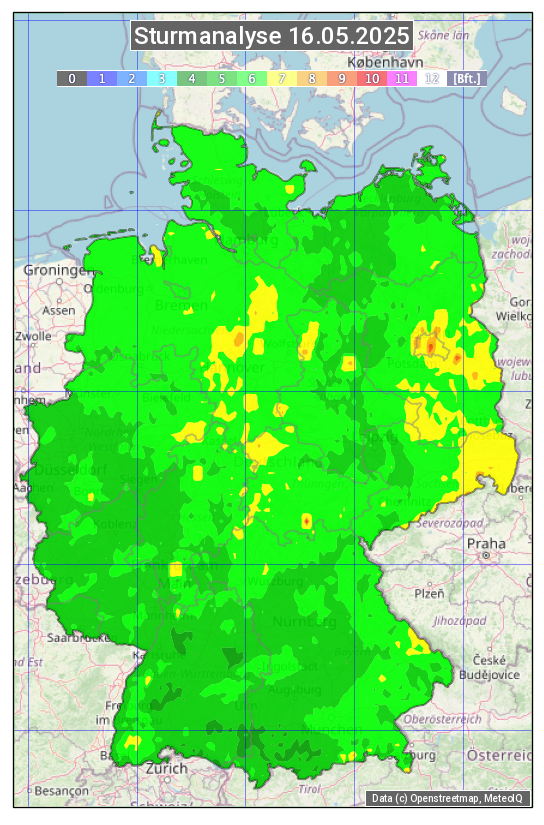 Die Sturmanalyse vom 16.05.2025 zeigt die maximalen Windböen des Tages. Die Angabe erfolgt als Windstärke in Beaufort.
