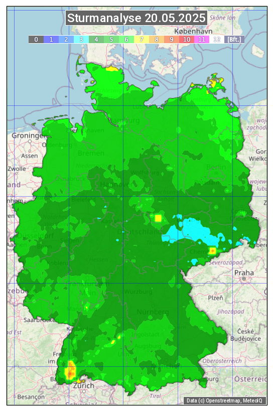 Die Sturmanalyse vom 20.05.2025 zeigt die maximalen Windböen des Tages. Die Angabe erfolgt als Windstärke in Beaufort.