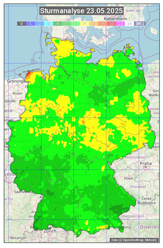 Die Sturmanalyse vom 23.05.2025 zeigt die maximalen Windböen des Tages. Die Angabe erfolgt als Windstärke in Beaufort.