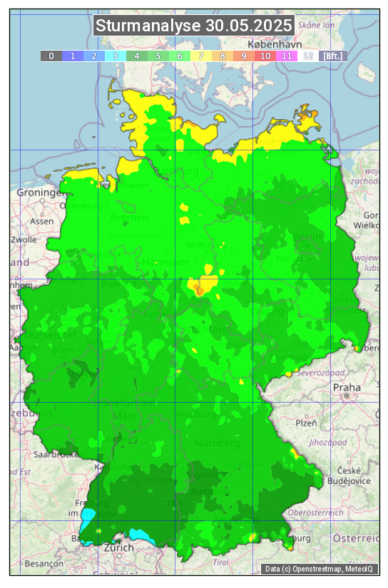 Die Sturmanalyse vom 30.05.2025 zeigt die maximalen Windböen des Tages. Die Angabe erfolgt als Windstärke in Beaufort.