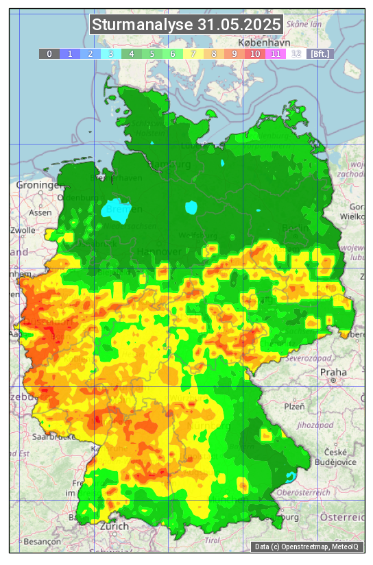Die Sturmanalyse vom 31.05.2025 zeigt die maximalen Windböen des Tages. Die Angabe erfolgt als Windstärke in Beaufort.