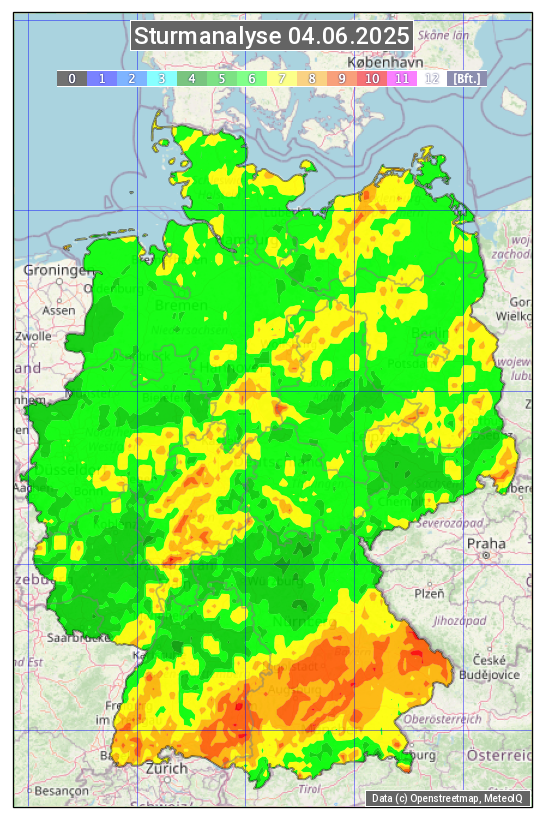 Die Sturmanalyse vom 04.06.2025 zeigt die maximalen Windböen des Tages. Die Angabe erfolgt als Windstärke in Beaufort.