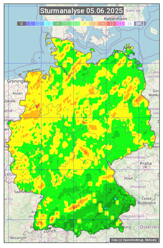 Die Sturmanalyse vom 05.06.2025 zeigt die maximalen Windböen des Tages. Die Angabe erfolgt als Windstärke in Beaufort.