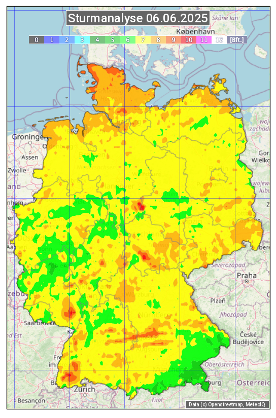 Die Sturmanalyse vom 06.06.2025 zeigt die maximalen Windböen des Tages. Die Angabe erfolgt als Windstärke in Beaufort.