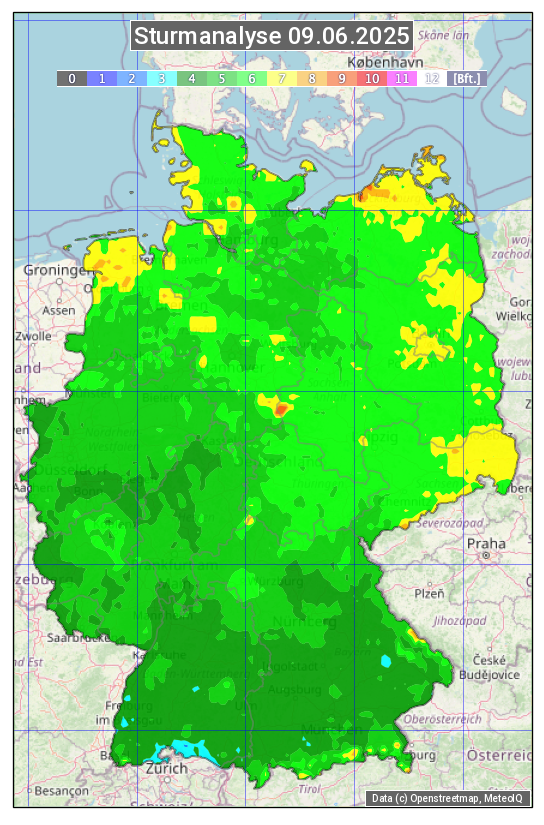 Die Sturmanalyse vom 09.06.2025 zeigt die maximalen Windböen des Tages. Die Angabe erfolgt als Windstärke in Beaufort.
