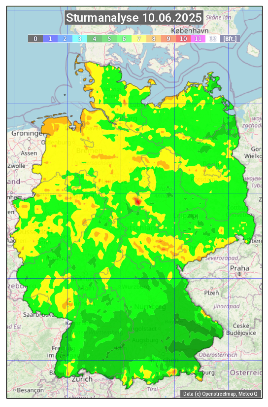 Die Sturmanalyse vom 10.06.2025 zeigt die maximalen Windböen des Tages. Die Angabe erfolgt als Windstärke in Beaufort.