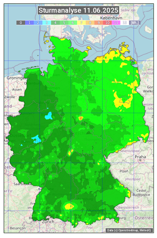 Die Sturmanalyse vom 11.06.2025 zeigt die maximalen Windböen des Tages. Die Angabe erfolgt als Windstärke in Beaufort.