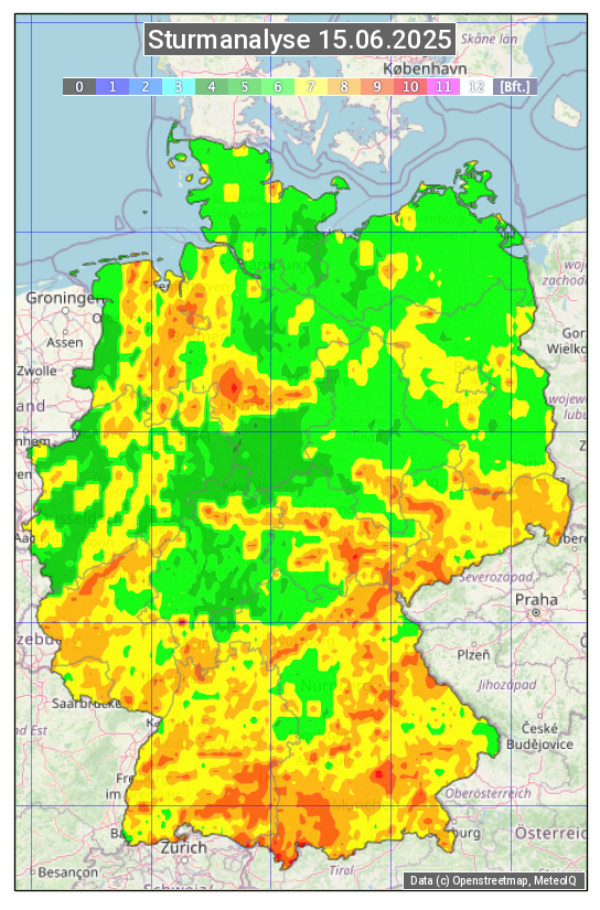 Die Sturmanalyse vom 15.06.2025 zeigt die maximalen Windböen des Tages. Die Angabe erfolgt als Windstärke in Beaufort.