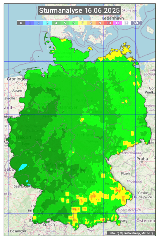 Die Sturmanalyse vom 16.06.2025 zeigt die maximalen Windböen des Tages. Die Angabe erfolgt als Windstärke in Beaufort.