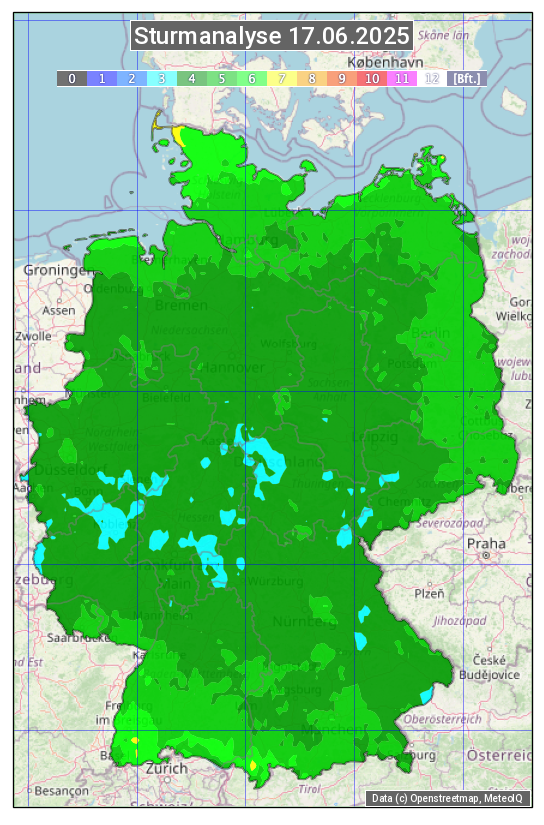 Die Sturmanalyse vom 17.06.2025 zeigt die maximalen Windböen des Tages. Die Angabe erfolgt als Windstärke in Beaufort.